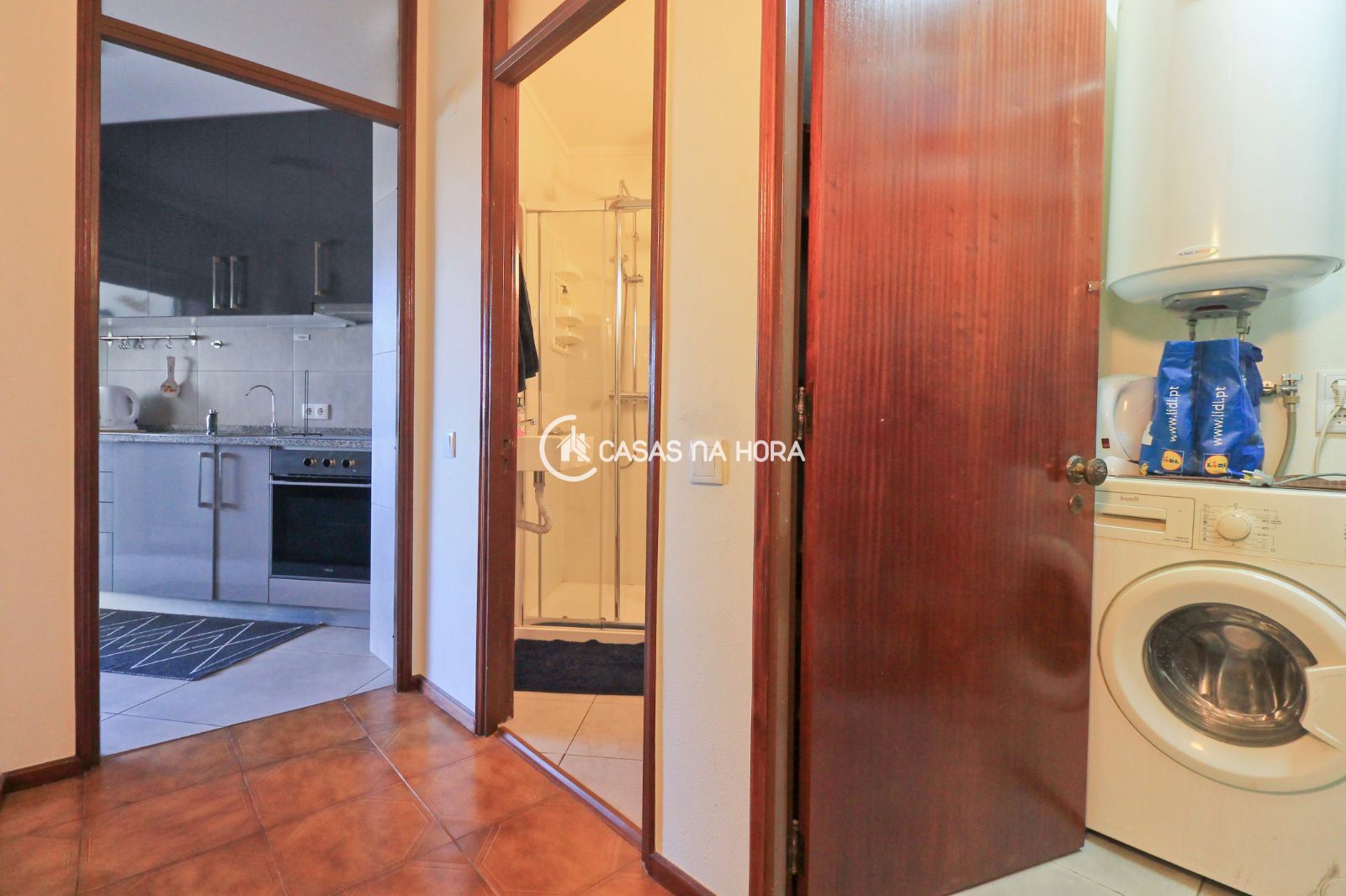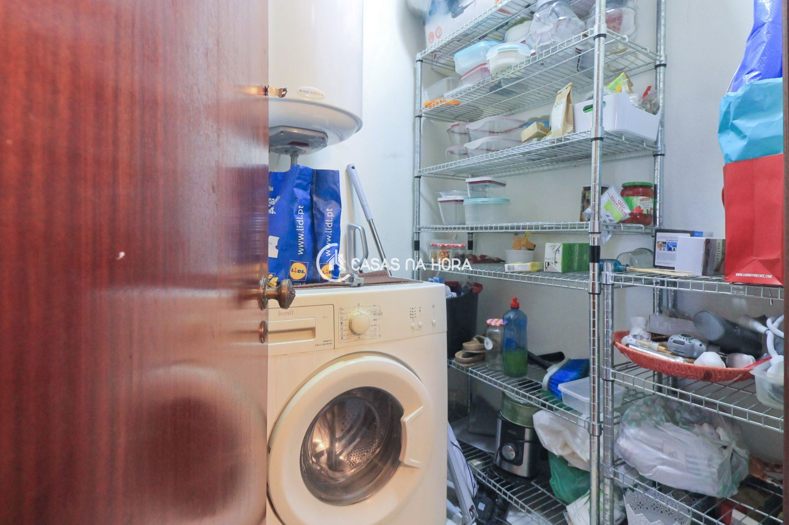 -divisão de despensa com prateleiras para arrumação e máquina de lavar a roupa;
