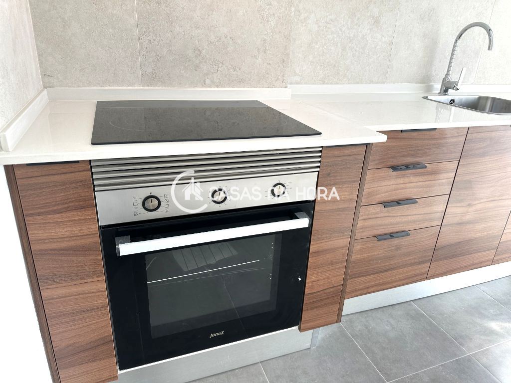 Cozinha totalmente equipada com placa vitrocerâmica, forno, exaustor, frigorífico, termoacumulador e máquina de lavar roupa.