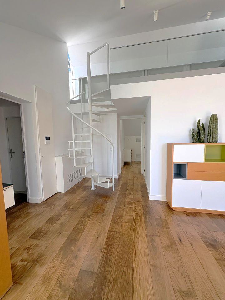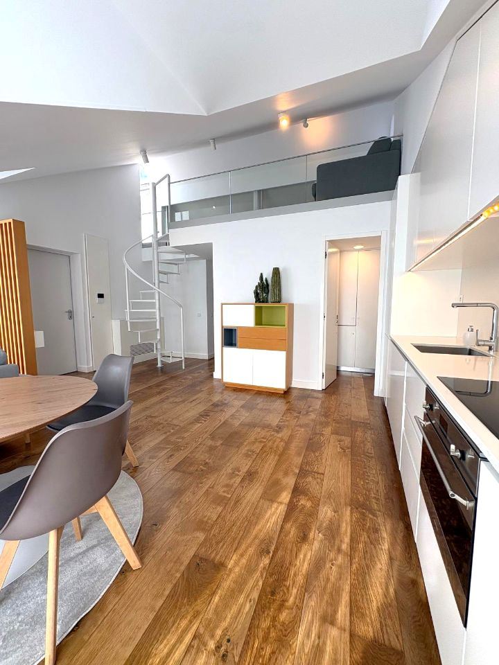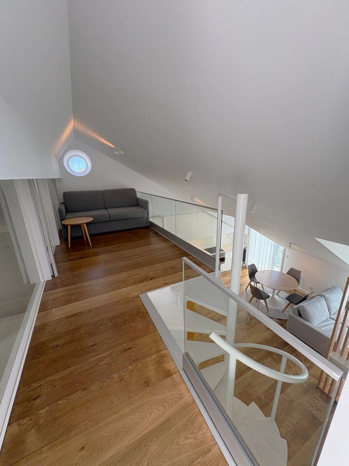 No piso superior, a mezzanine acrescenta versatilidade ao imóvel, ideal como zona de leitura, escritório ou espaço de lazer, sempre com abundante luz natural.