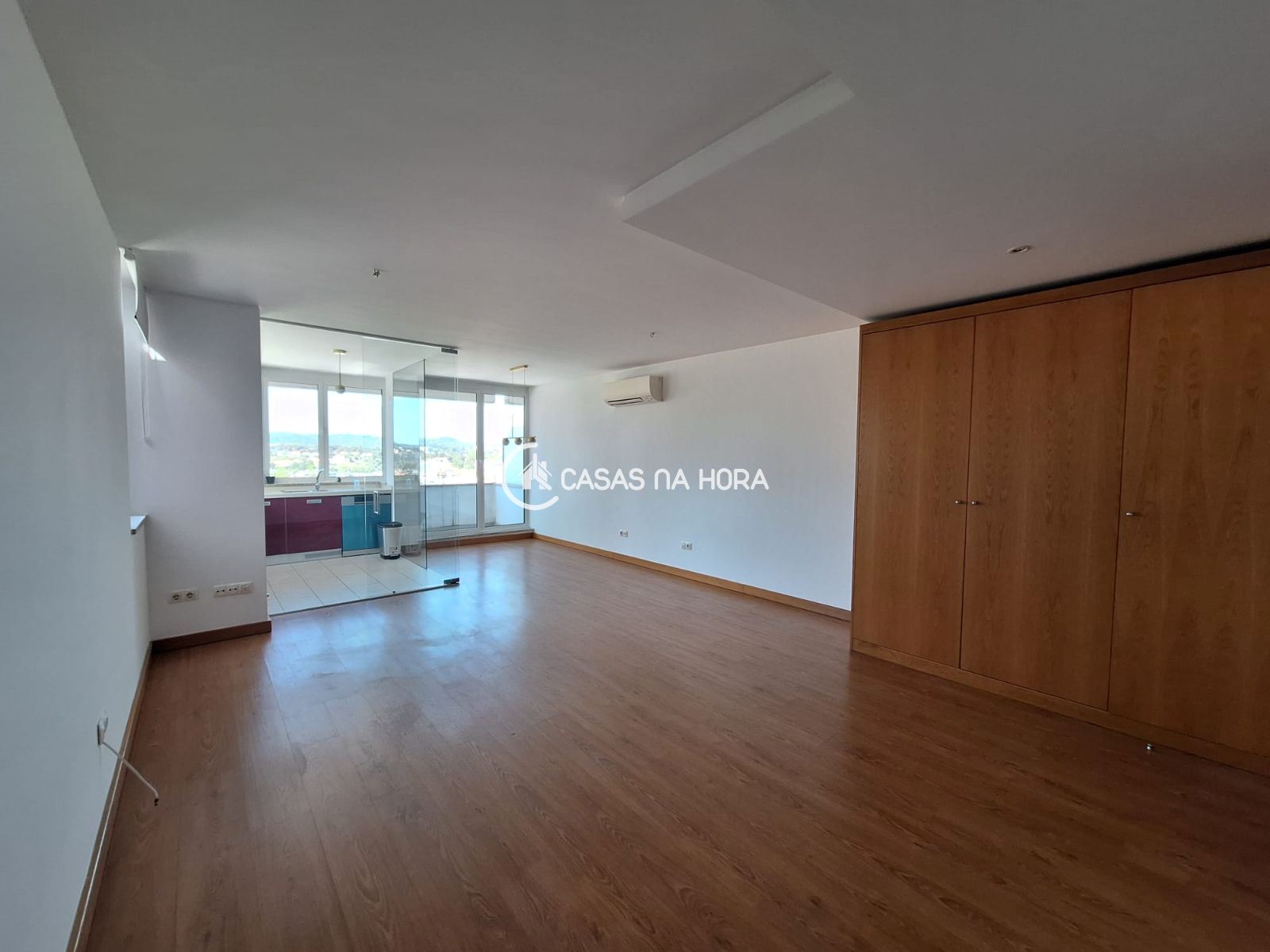 Sala/cozinha equipada com placa de fogão, forno, frigorifico, máquina de lavar loiça, máquina de lavar roupa, esquentador e exaustor, 1 quarto com roupeiro embutido e 1 Wc.