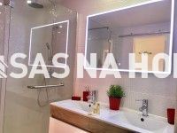 A casa de banho tem espelho com iluminação LED e lavatório duplo.
