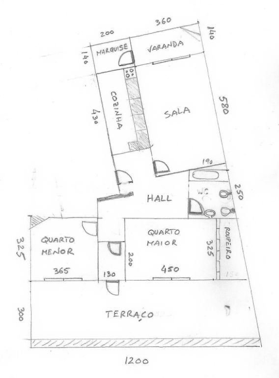 As divisões são as seguintes (ver dimensões aproximadas no esboço da planta disponibilizado nas fotografias):