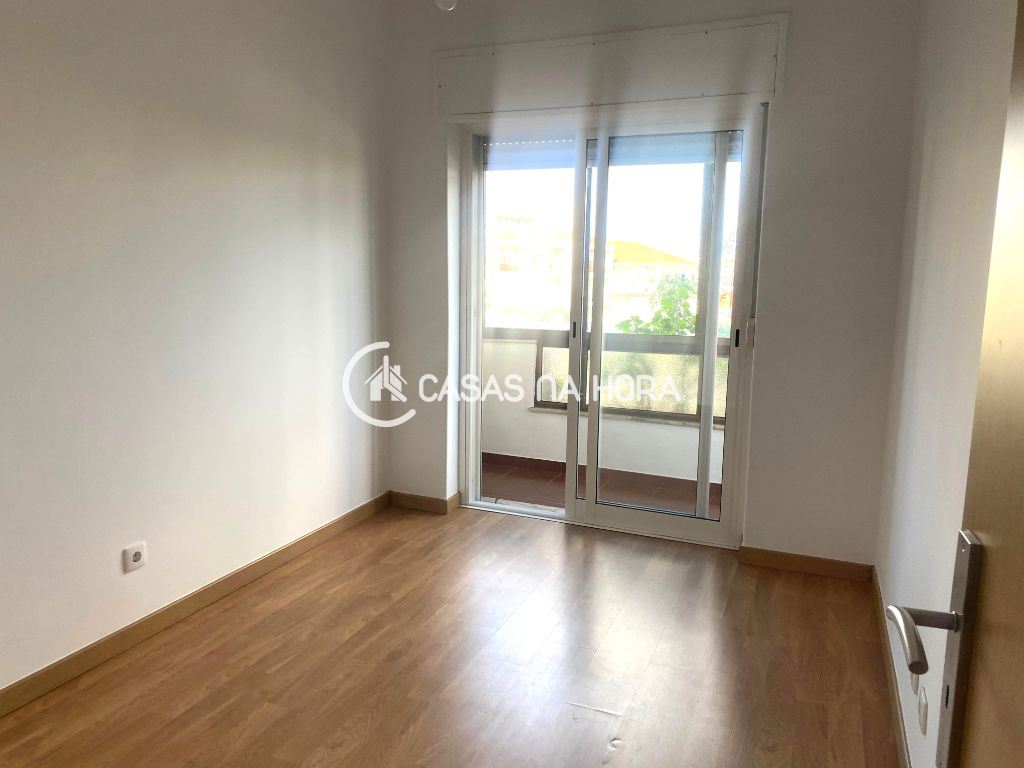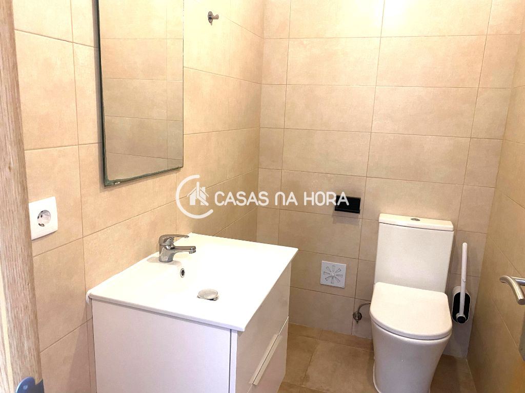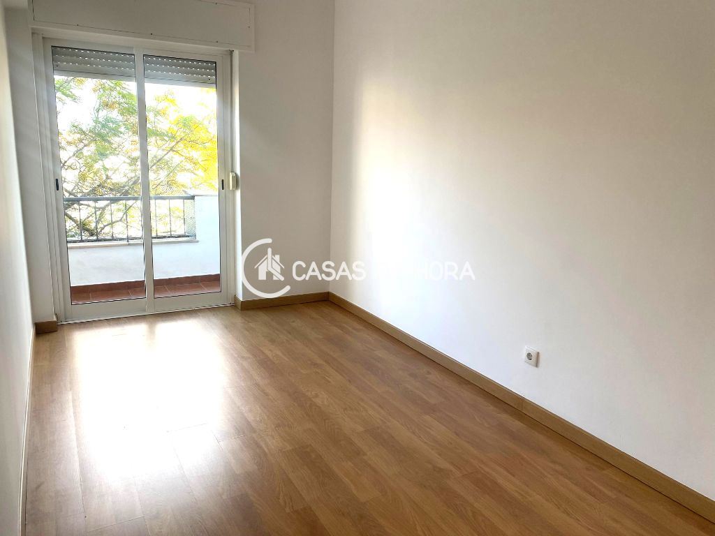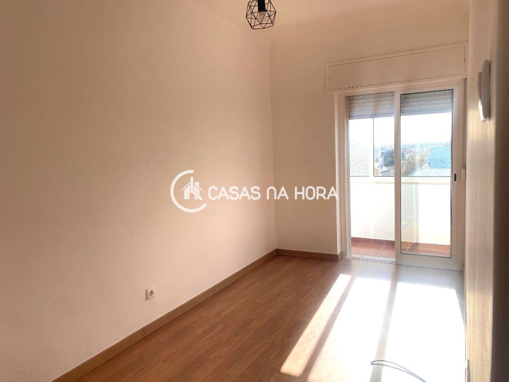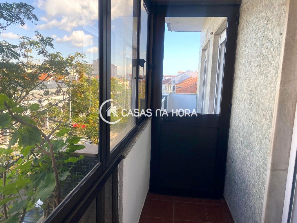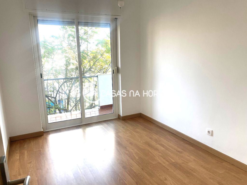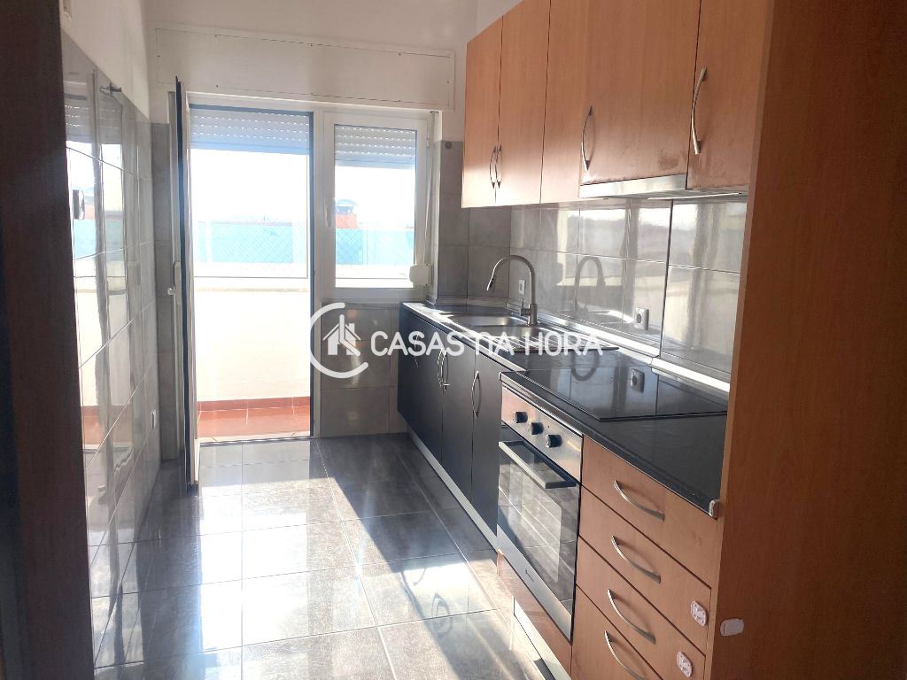 A cozinha está semi-equipada com placa, forno, exaustor e termoacumulador, com acesso à varanda. A sala tem 12 m2 e chão flutuante.