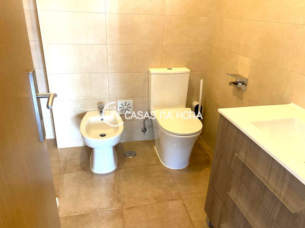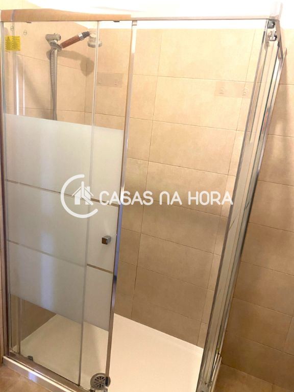 O apartamento tem 2 casa de banho, sendo uma social e outra com cabine de duche.