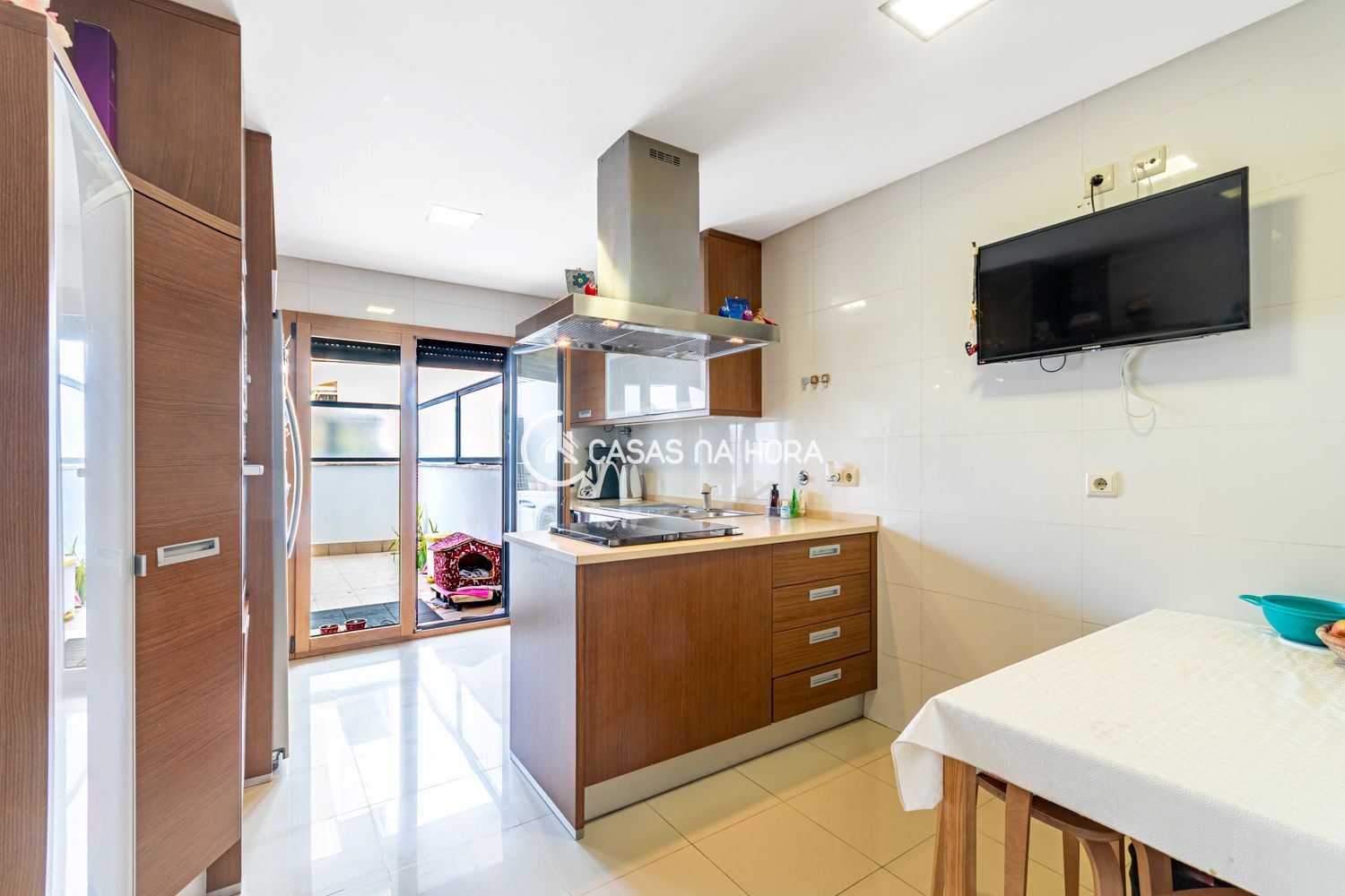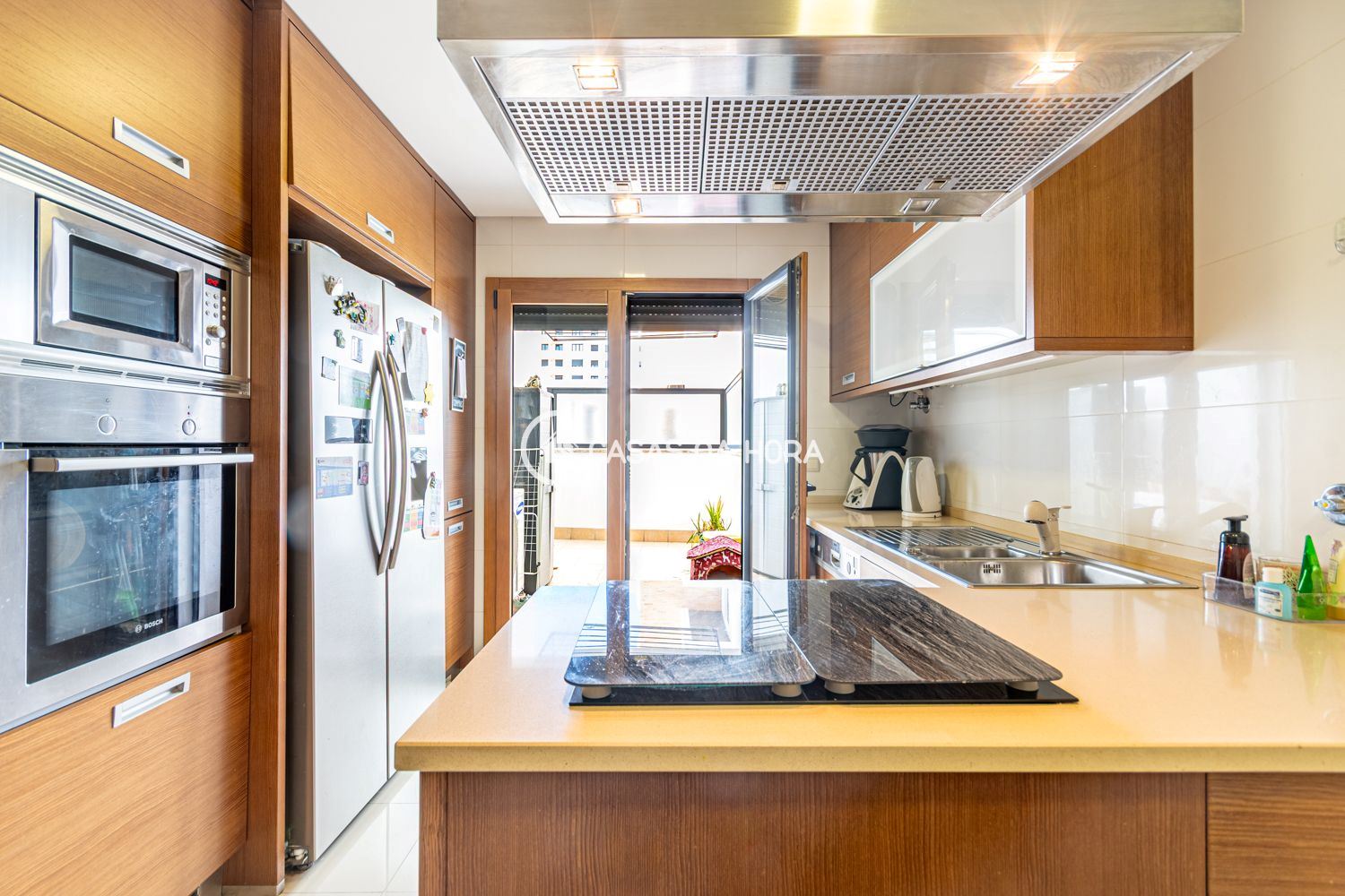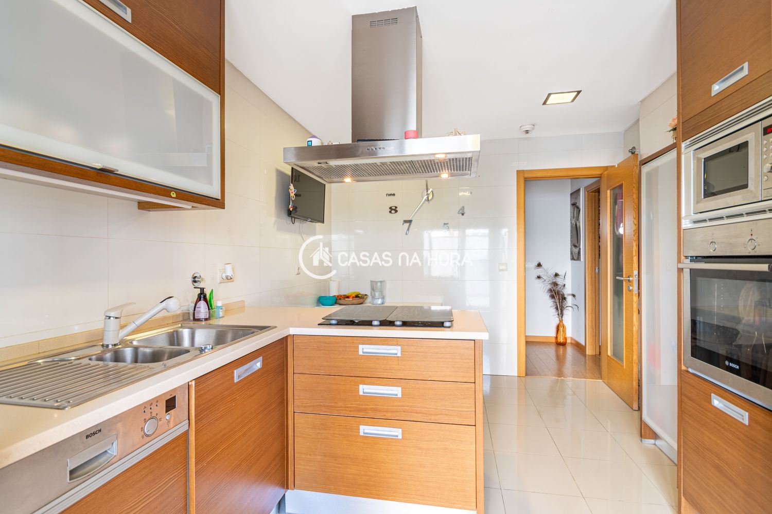 Cozinha funcional com 13 m², equipada com eletrodomésticos Bosch encastrados (placa, exaustor, forno, micro-ondas, máquinas de lavar loiça, roupa), detetor de incêndio e acesso direto ao terraço de 25 m² com churrasqueira.