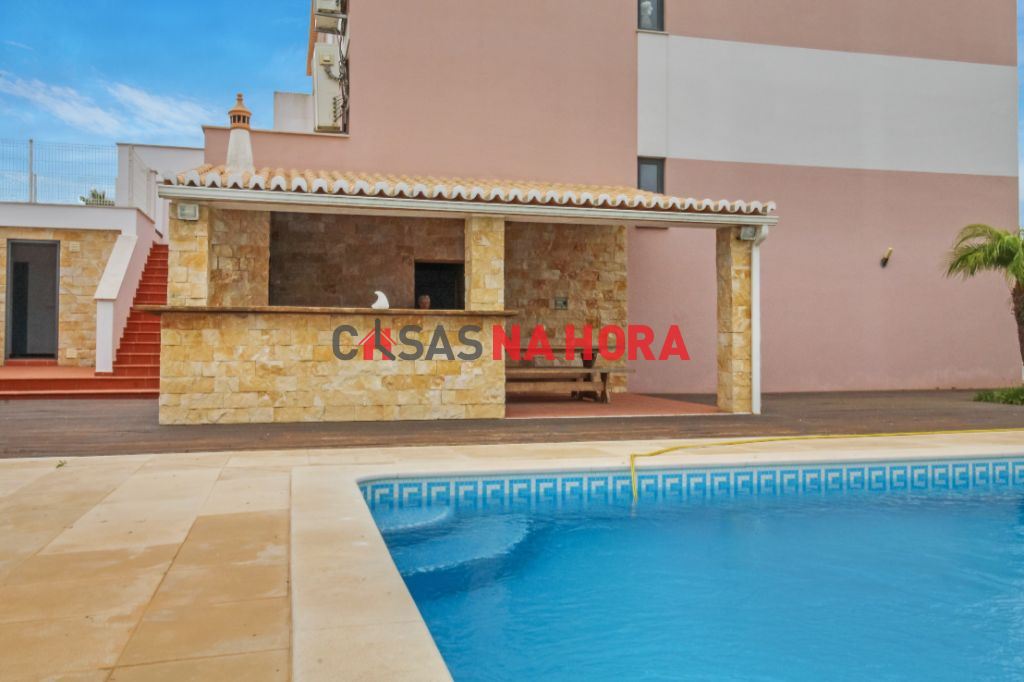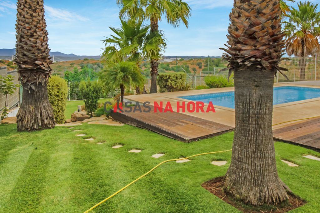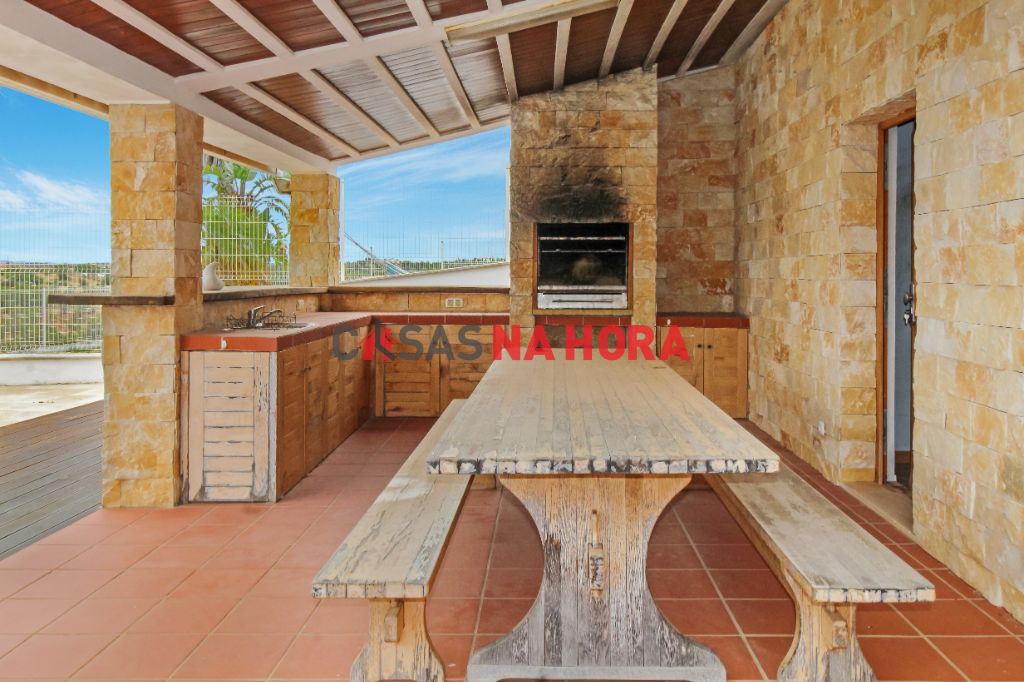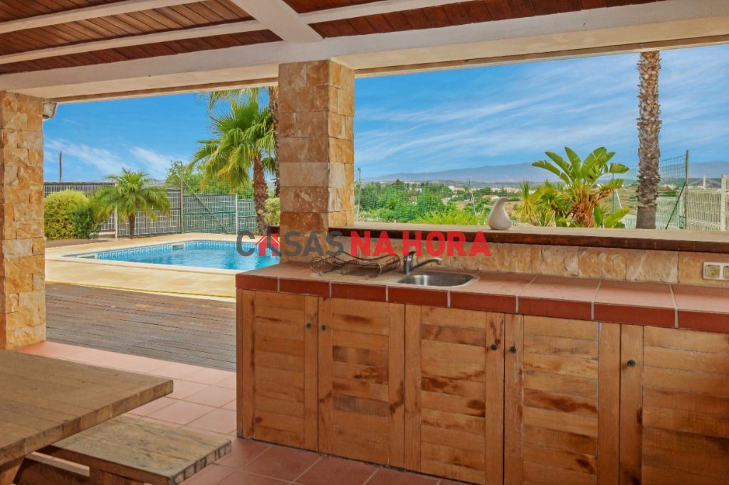 A sala dá acesso a uma cozinha totalmente equipada, com despensa e com fogão a gás. Da cozinha temos acesso a um pátio e à área de piscina e barbeque na qual poderá desfrutar de agradáveis refeições em família. Esta zona de jardim muito espaçosa, possui também garrafeira, casa de banho e uma grande mesa de refeições em madeira maciça para disfrutar com toda a comudidade e excelentes vistas sobre a serra de Monchique. Esta é uma zona perfeita para o convívio familiar e refeições à beira da piscina.