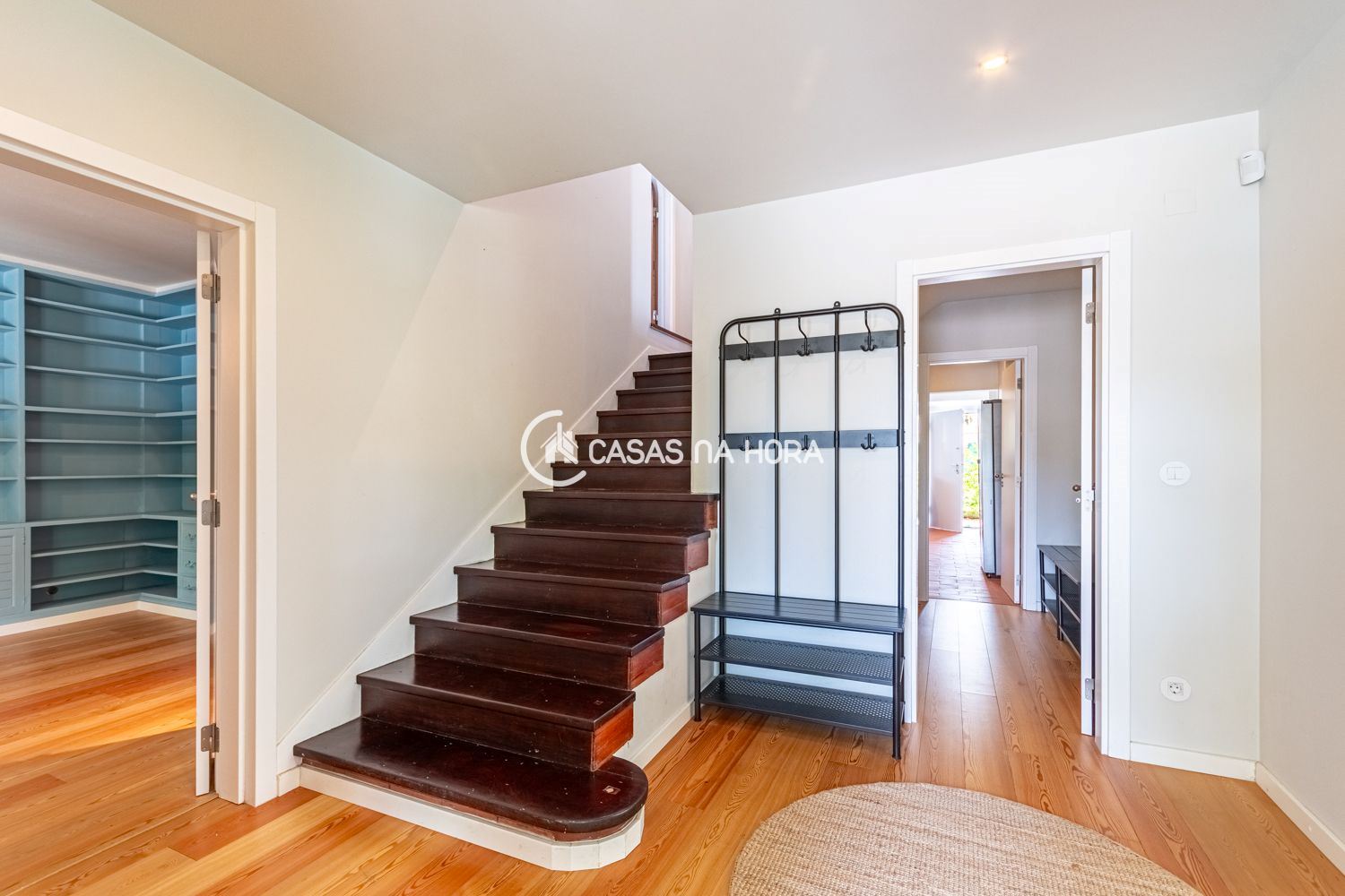 No piso térreo encontra-se ainda uma zona de entrada organizada, com acesso a diferentes divisões e escada para o piso superior, onde se distribuem os quartos, e um escritório com lareira.